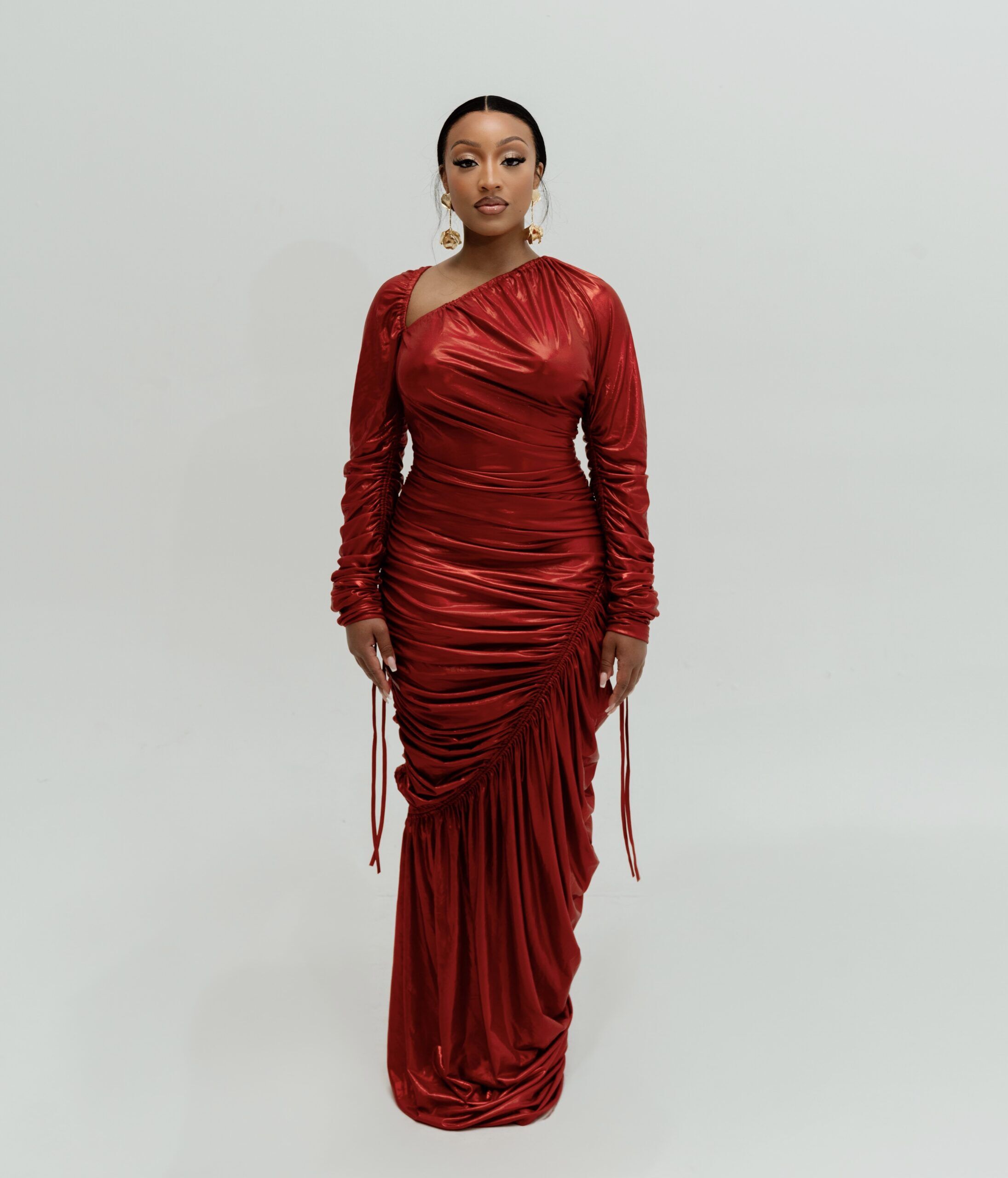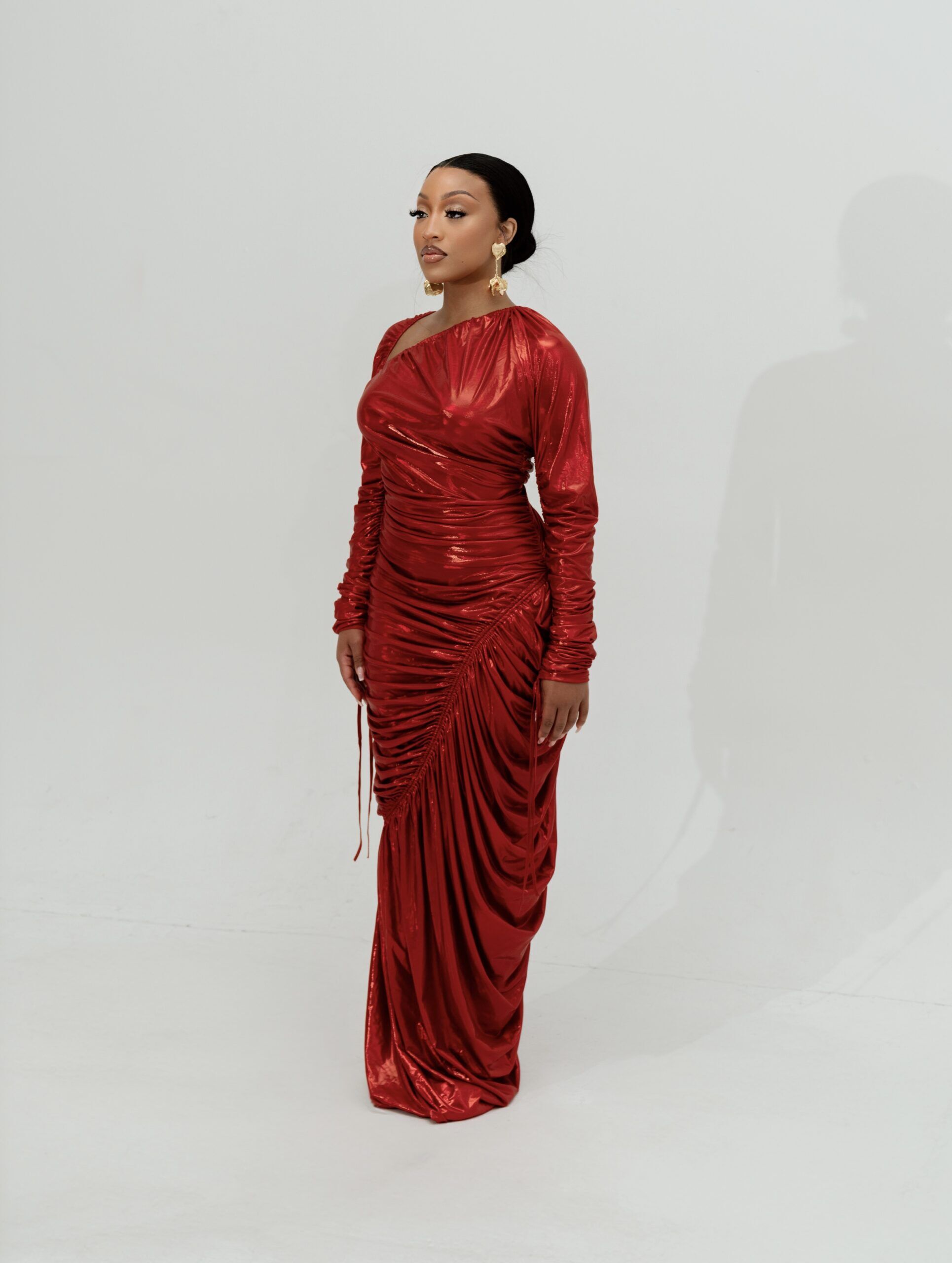 Effortlessly elegant, the Bella Dress in red is crafted from glossy fabric that adds a touch of allure. It features an adjustable rope detail on the sleeve for a customizable and comfortable fit. Perfect for any occasion, this dress is a must-have for any fashion-forward wardrobe.
