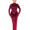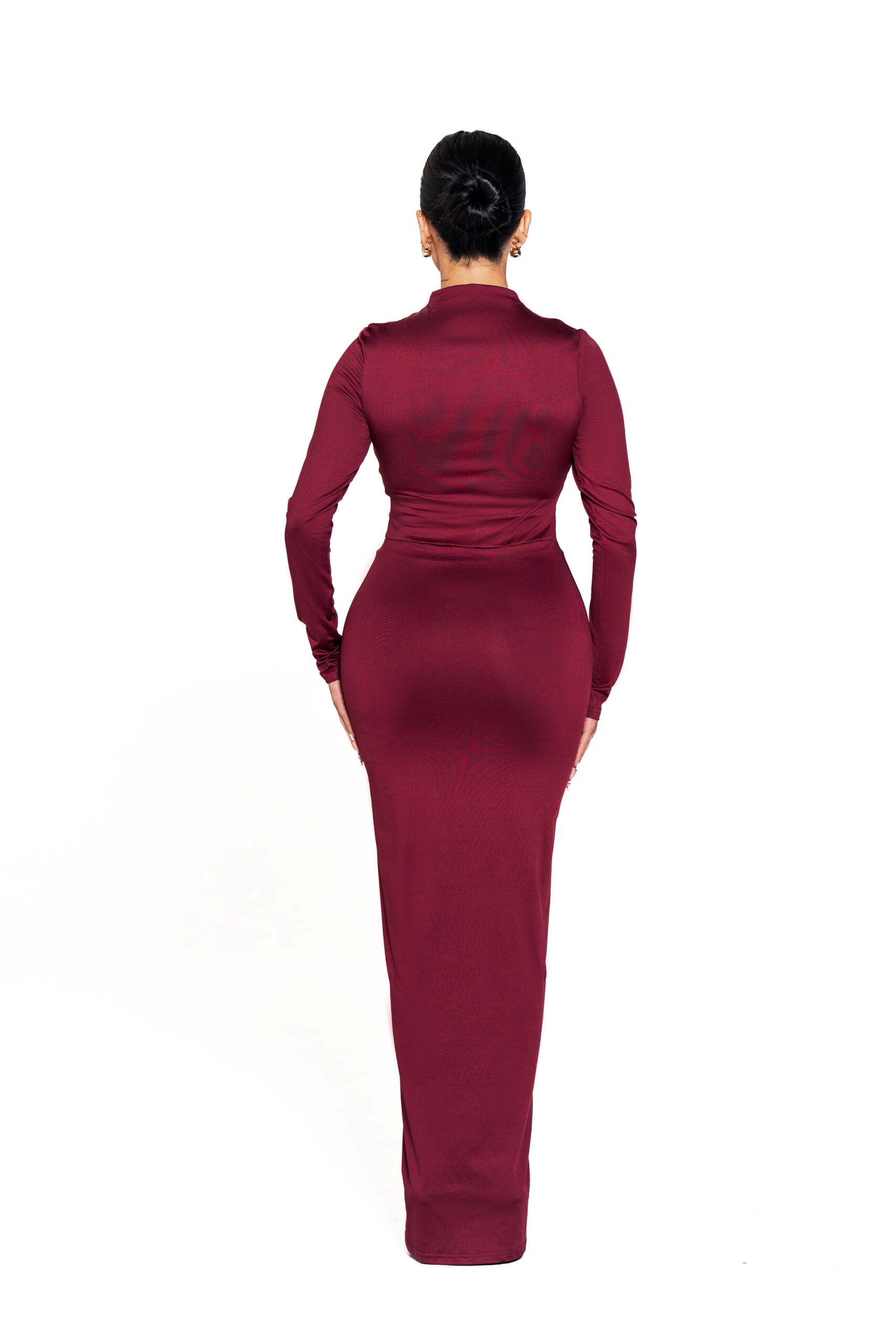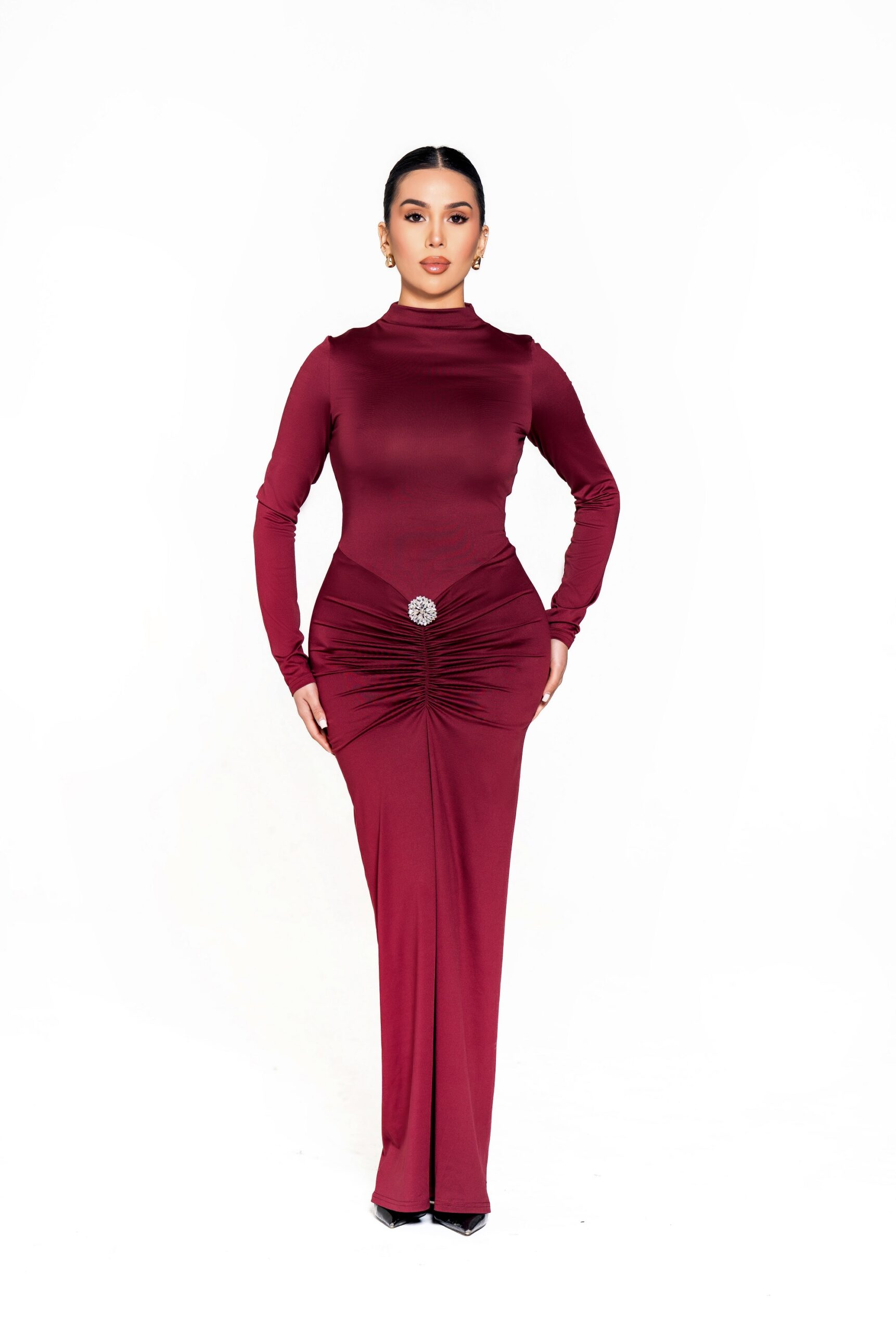 Make an unforgettable entrance in the Bellissima Burgundy High-Neck Maxi Dress, where timeless elegance meets modern allure. Crafted from premium stretch jersey in a rich burgundy hue, this figure-skimming silhouette contours the body beautifully for a sleek, flattering finish. The high neckline and long sleeves evoke classic sophistication, while the ruched detailing and crystal-accented front twist introduce a refined statement touch. Perfectly suited for formal occasions, elegant dinners, and evening affairs, this gown pairs effortlessly with a sleek clutch and bold jewelry.