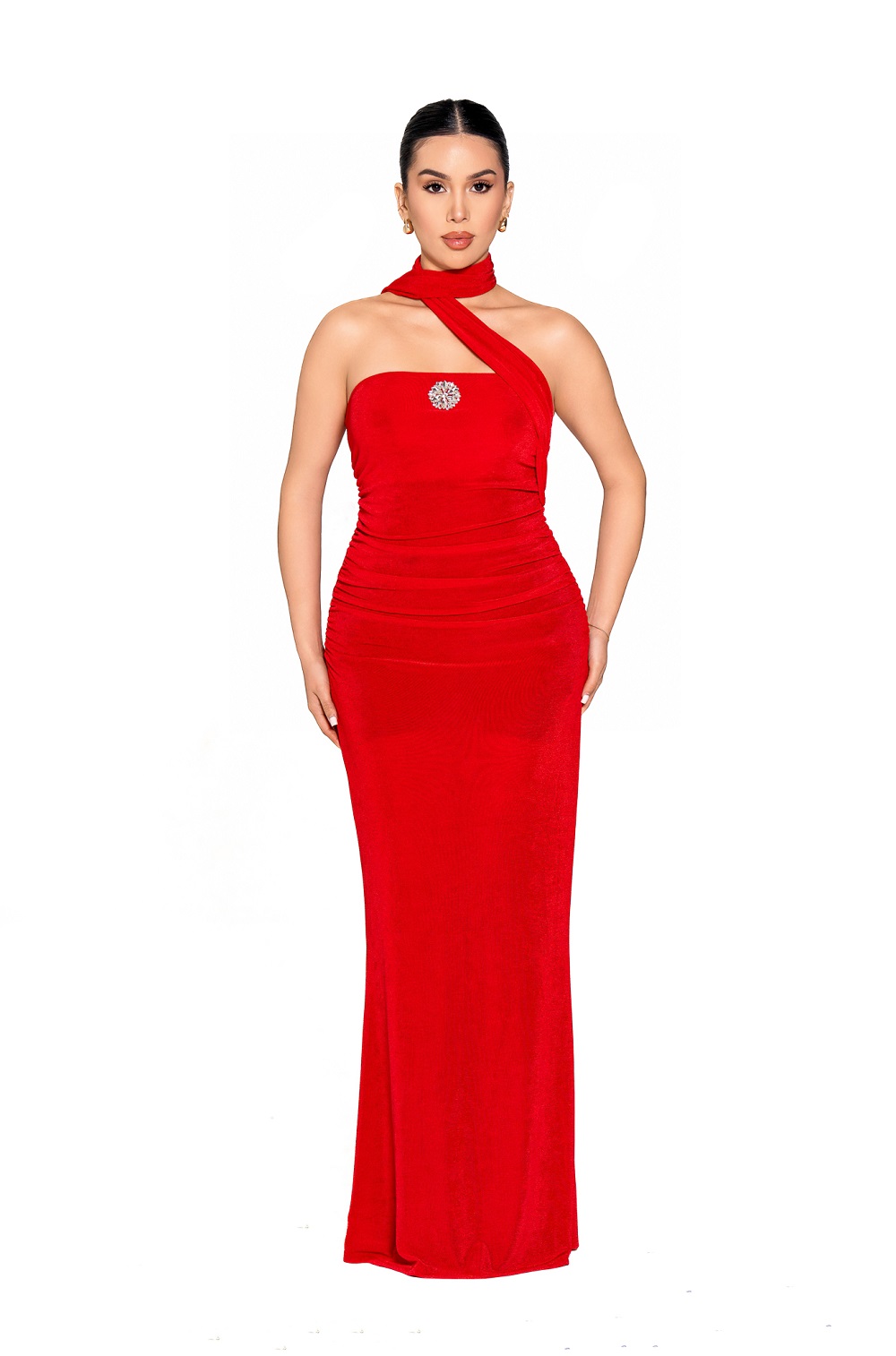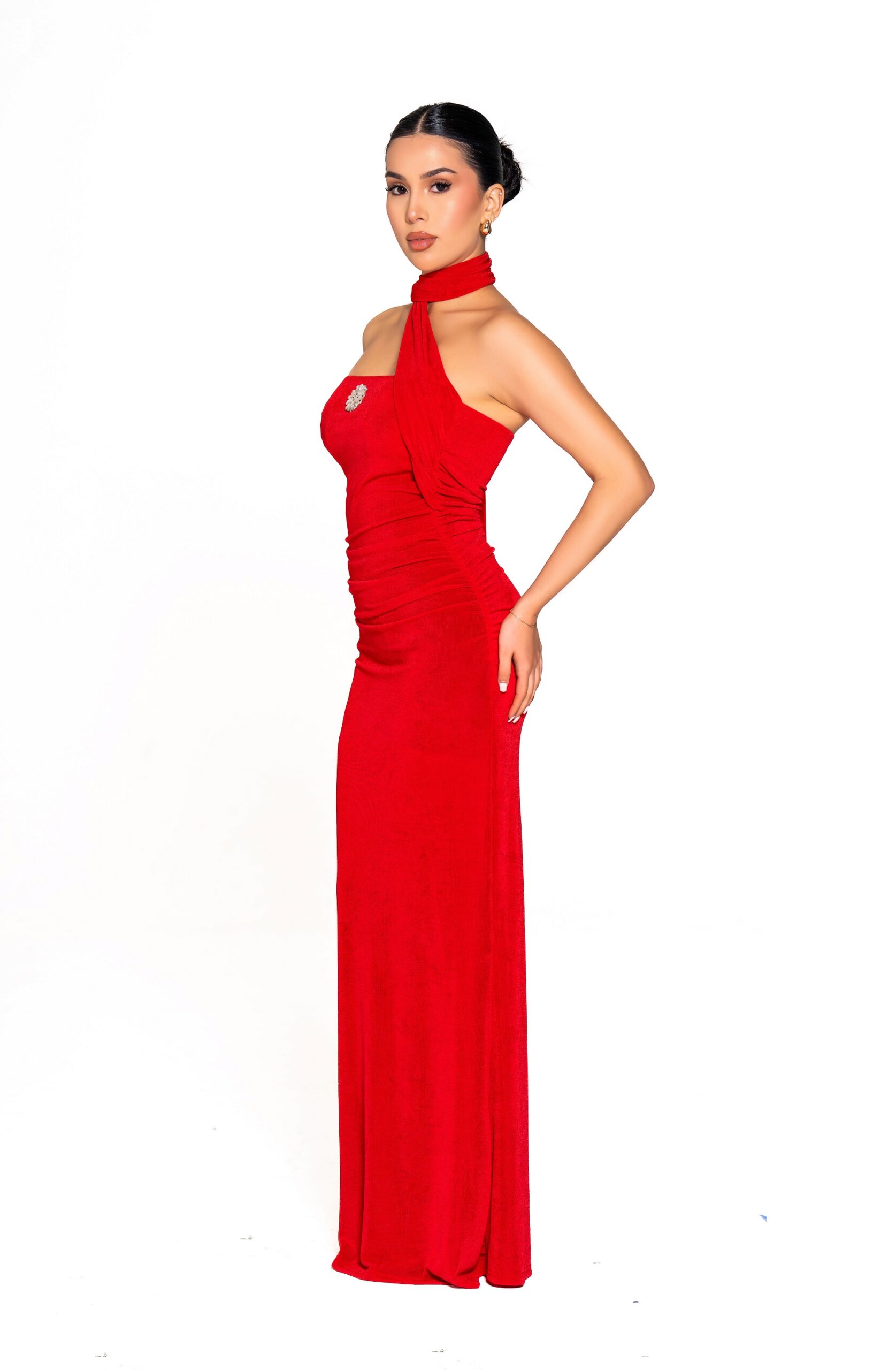 A statement in sophistication, our Red Evening Maxi Gown features a sleeveless, backless ruched design that sculpts the body and flows into a dramatic mermaid hem. Minimal yet impactful, this piece embodies effortless elegance perfect for elevated dinners and refined occasions.