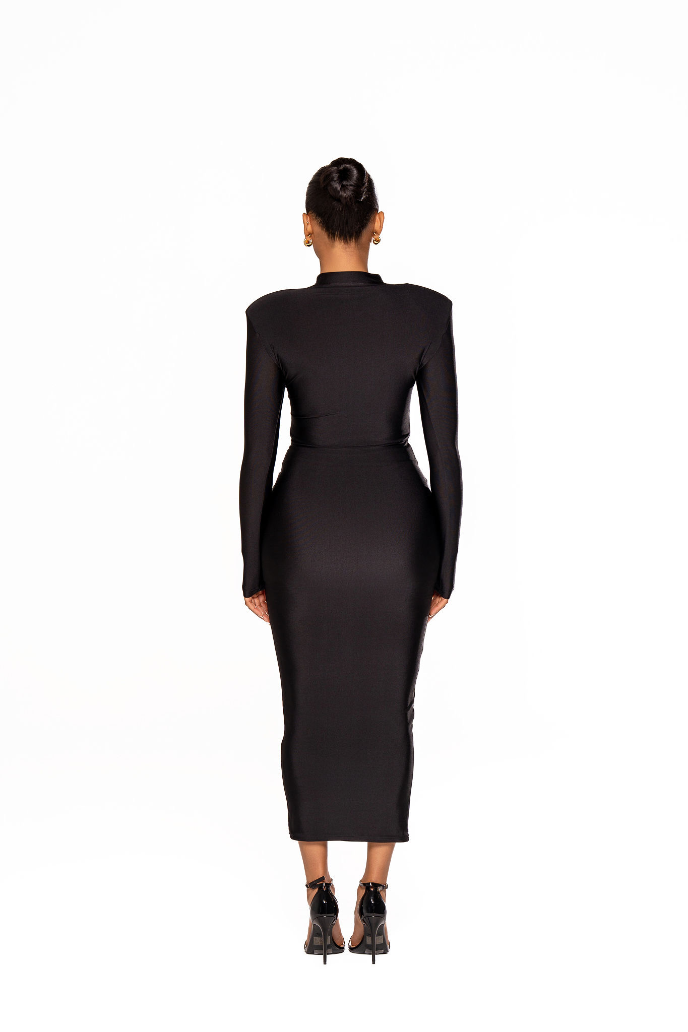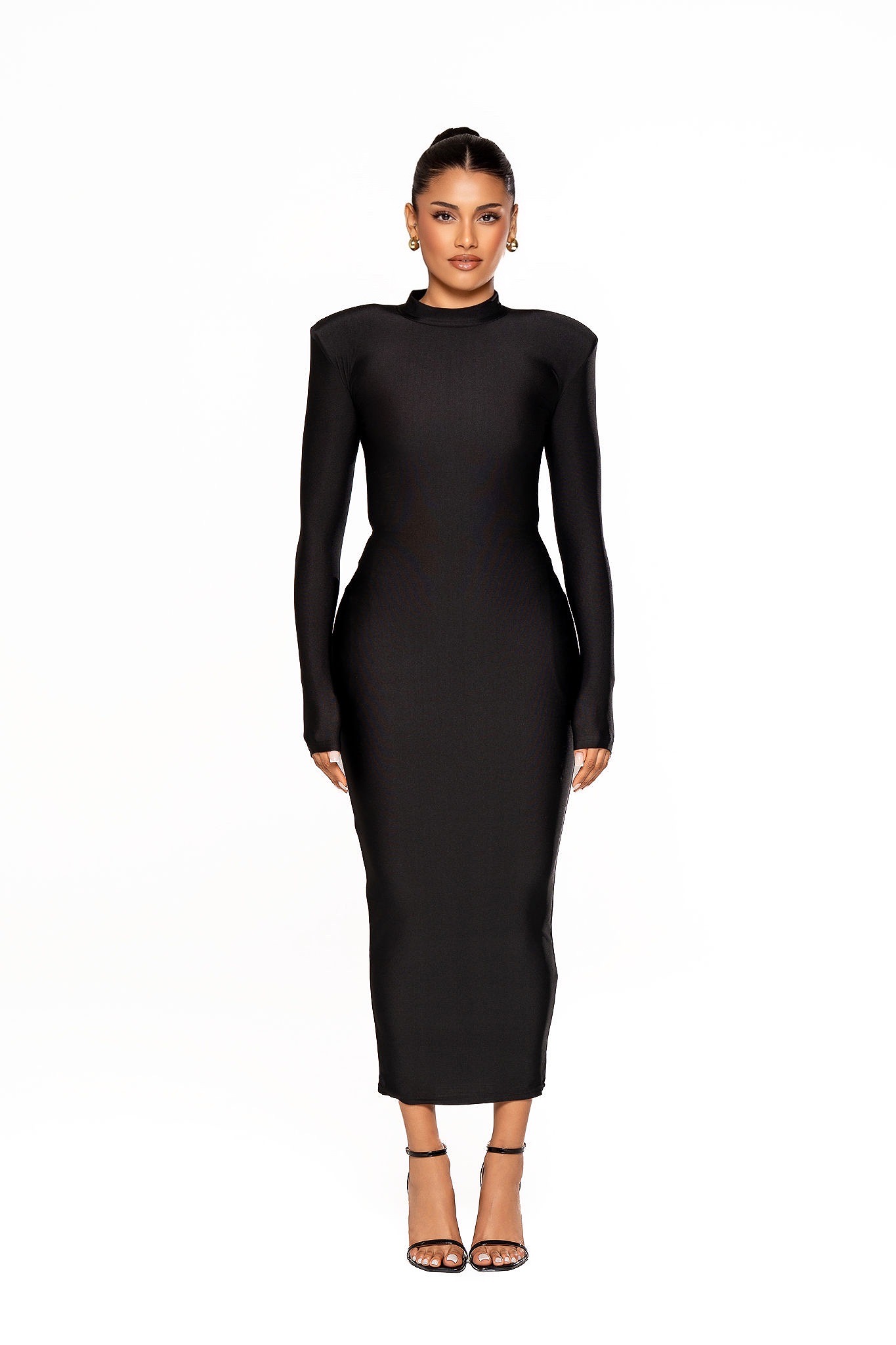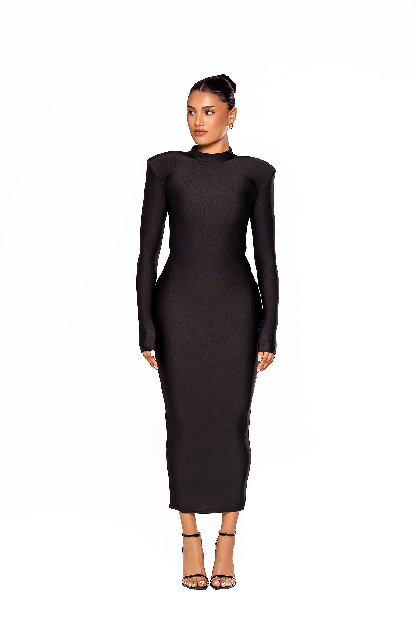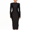 Sculpted Elegance, No Shapewear Needed. Our black bodycon dress is designed to embrace your shape with a smooth, second-skin feel. Crafted from soft, high-stretch fabric, it effortlessly sculpts and flatters without the need for shapewear. The sleek mock neck silhouette brings a touch of understated sophistication, making it the perfect piece to carry you from brunch to night with comfort, confidence, and ease.