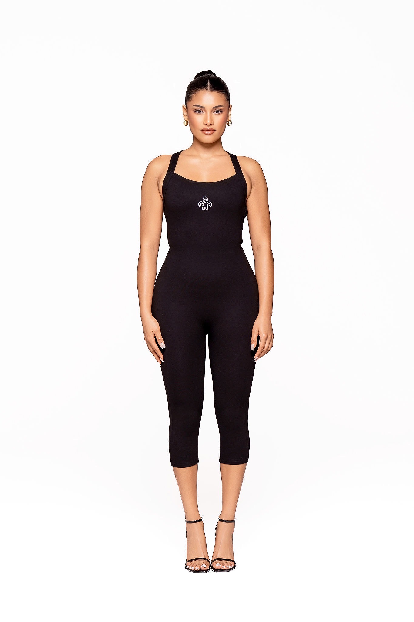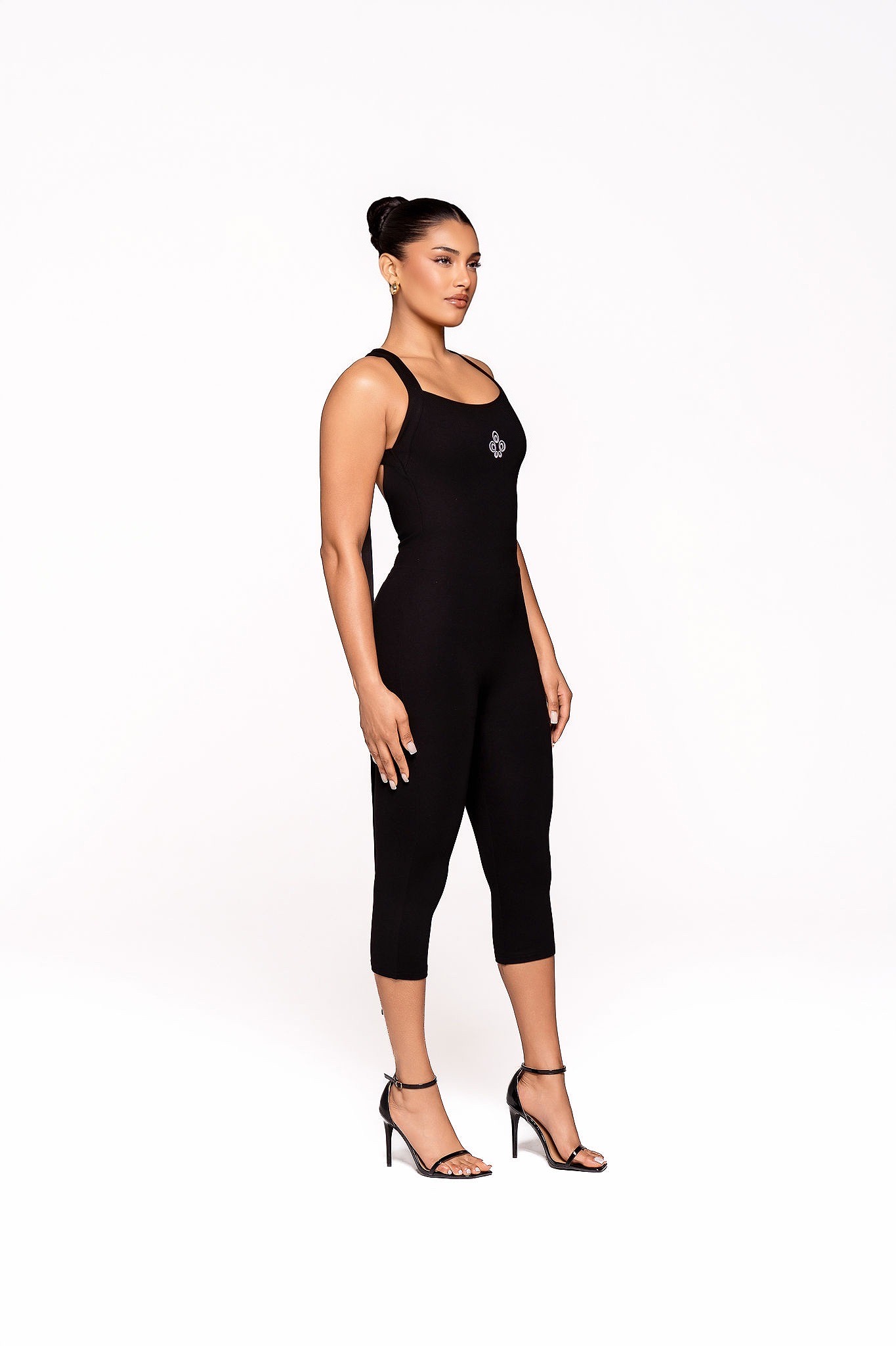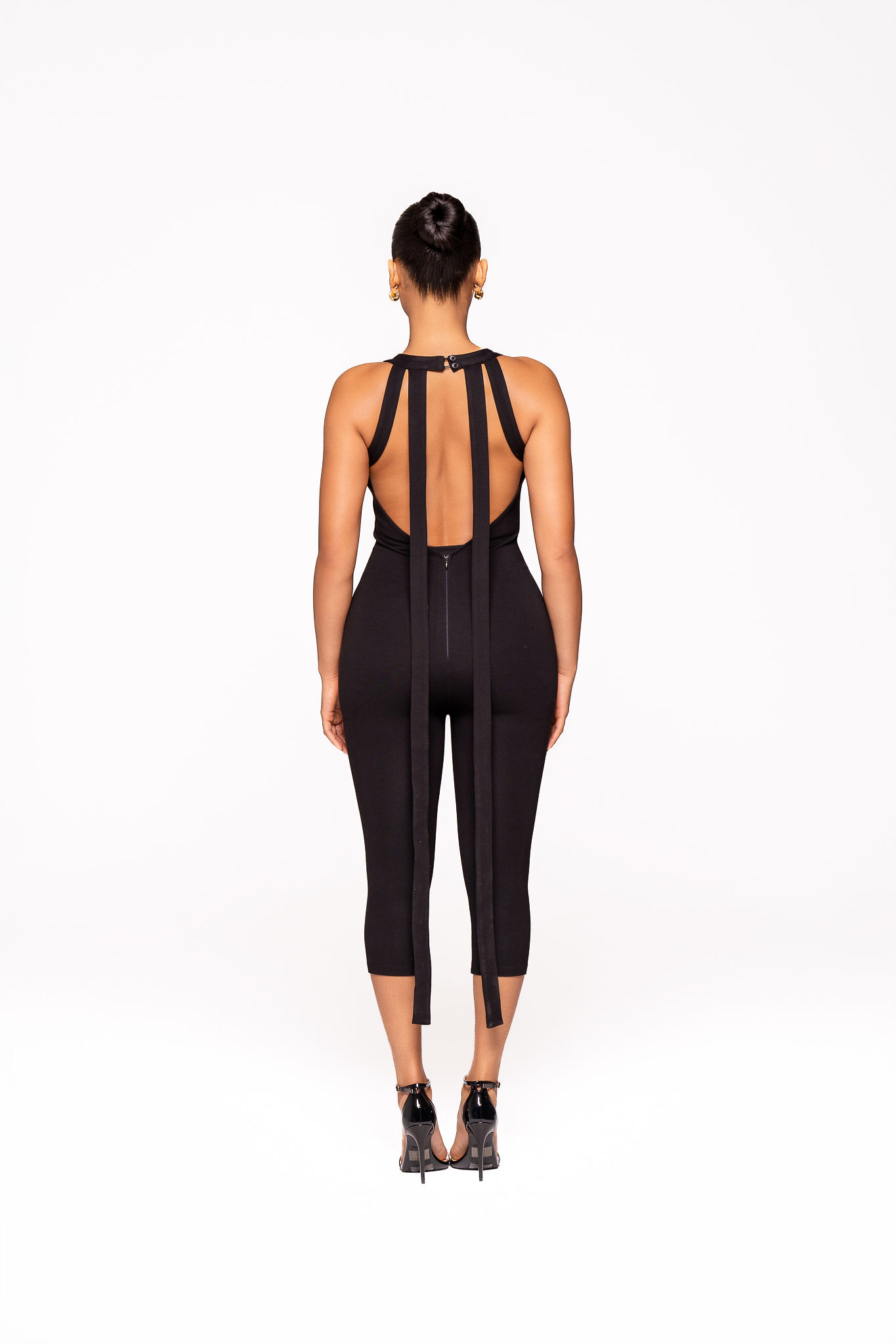 Turn heads in our bold and fashion forward Capri Jumpsuit. Designed in sleek black, this statement piece features a deep low-back silhouette that perfectly balances sophistication with seductive edge ideal for date nights and after-dark moments. A long, dramatic rope detail cascades from the neckline down the back, creating fluid movement and elevated impact. The front showcases our embroidered logo at the center, adding a signature touch. Finished with an invisible zip and discreet button closure, the fit is smooth, seamless, and effortlessly flattering. This is more than a jumpsuit, it’s a moment.